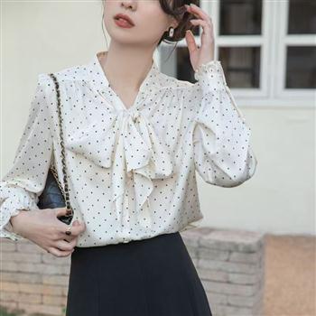 YF6469-图片色韩版甜美时尚蝴蝶结波点水木耳边长袖立领设计感大码雪纺衬衣