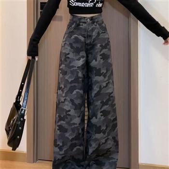 YF6479-图片色时尚辣妹迷彩印花直筒坠地感拖地复古设计美式休闲牛仔裤