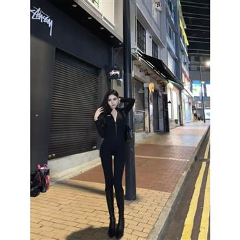 YF6480-图片色时尚辣妹秋冬新款长袖立领V领拉链弹力收腰包臀连体裤