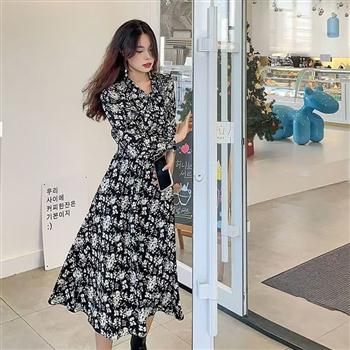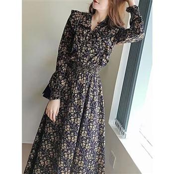 YF6606-图片色潮流时尚V领松紧腰收腹显瘦长袖春秋设计碎花赫本风连衣裙
