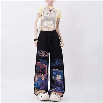 YF6483-(2色入内)美式多巴胺不规则涂鸦卡通个性松紧腰绑绳直筒坠地感休闲卫衣裤