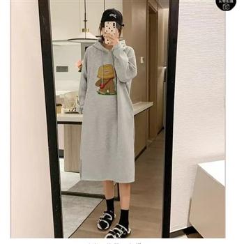 YF6484-(2色入内)冬天学院风帽子熊熊设计慵懒风长袖连帽宽松大码加厚卫衣衣裙