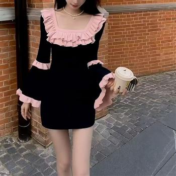 YF6488-图片色纯欲风喇叭袖套头荷叶边修腰包臀黑色网纱百搭连衣裙