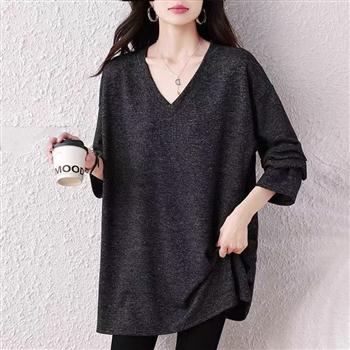 YF6492-图片色春秋大码显瘦V领慵懒风港式中长款时尚百搭纯色休闲潮T恤