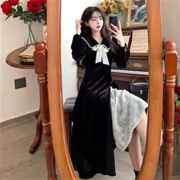 YF6498-图片色甜美时尚娃娃领系蝴蝶结撞色开叉拼接设计感金丝绒冬季连衣裙