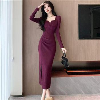 YF6599-(3色入内)精品秋冬新款长袖方领修腰褶折开叉鱼尾设计名媛风连衣裙