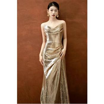 YF6600-图片色性感无袖抹胸褶折收腰亮片设计轻奢感拖地长裙 名媛风宴会礼服