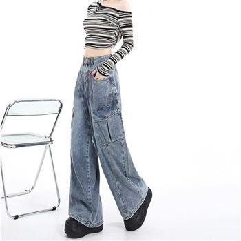 YF6604-图片色韩版慵懒风新款系扣高腰拼接阔腿坠地感大码休闲牛仔裤