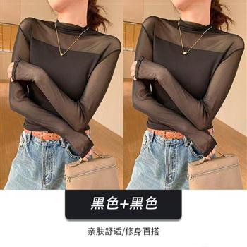 YF6605-(2色入内)纯欲风透视网纱拼接长袖弹力修身双层气质蕾丝新款打底衫