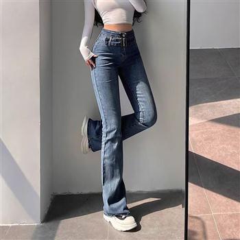 YF6607-图片色复古气质双排扣系扣修腰提臀微喇叭辣妹百搭休闲牛仔裤
