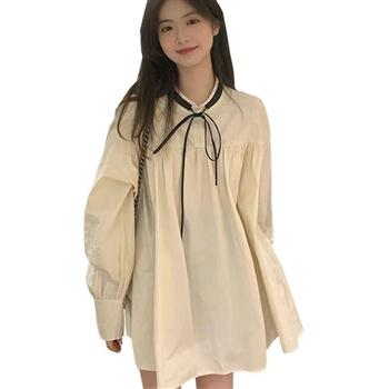 YF5006-图片色甜美时尚宽松大码长袖立领系蝴蝶结褶折大码娃娃范连衣裙