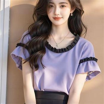 YF5008-图片色设计感减龄木耳边拼接短袖圆领大码正肩小心机夏季上衣