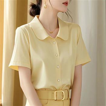 YF5010-(3色入内)高级感娃娃领短袖系扣大码简约纯色淑女气质时尚雪纺衫