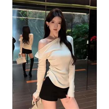 YF4221-(3色入内)欲女风露肩叠领褶折长袖套头弹力修身针织上衣