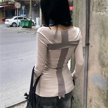 YF4224-图片色十字架设计小众撞色春装圆领长袖弹力显瘦美式长袖T恤