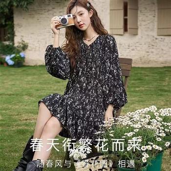 YF4223-图片色早春碎花圆领长袖田园风宽松小清新荷叶边大码连衣裙