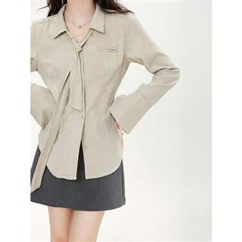 YF4211-图片色洋气春季新款小众设计侧系蝴蝶结百褶宽松大码长袖衬衫
