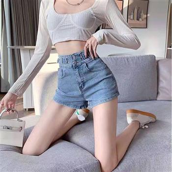 YF4228-(2色入内)时尚新款可调双排扣设计高腰A字包臀辣妹款牛仔短裤