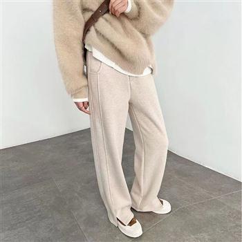 YF3804-(3色入内)时尚冬季毛呢直筒开叉小众设计感松紧腰拼接新款人字纹长裤