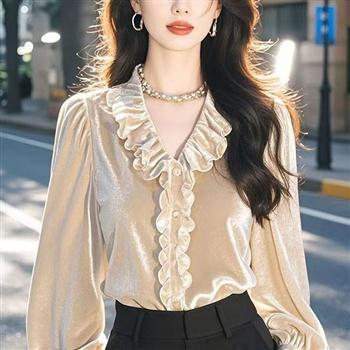 YF3805-图片色甜美秋冬新款泡泡袖荷叶边丝绒复古chic别致衬衫