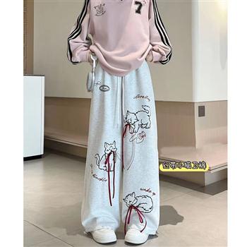 YF3808-(2色入内)小可爱猫咪系蝴蝶结设计宽松绑绳直筒坠地感卫衣裤