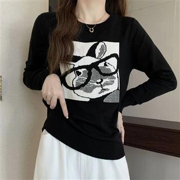 YF3809-(2色入内)时尚新款缇花编织数码感眼镜兔兔慵懒风针织上衣