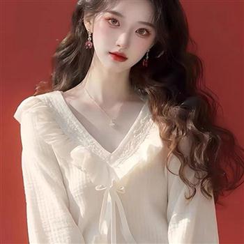 YF3801-图片色甜美时尚网纱拼接荷叶边V领系蝴蝶结华夫格宽松大码衬衫
