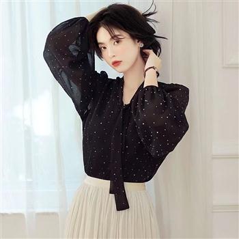 YF3812-图片色优雅时尚波点灯笼袖系领结宽松大码别致精品雪纺衫