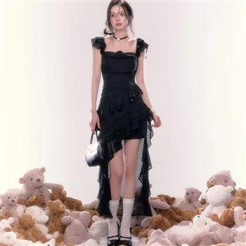 YF3814-(3色入内)名媛气质荷叶边方领玫瑰花束胸修腰不规则飘逸雪纺连衣裙