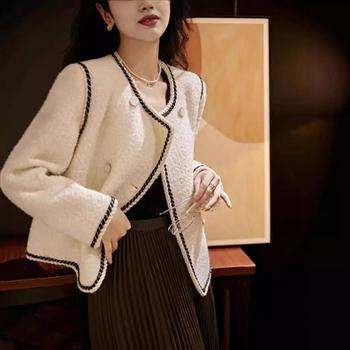 YF3815-(2色入内)2024新款小香风呢子别致撞色围边双排扣长袖大码气质上衣