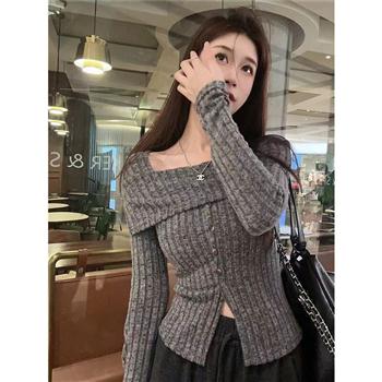 YF3816-(3色入内)秋冬一字肩方领系扣开叉坑条纹长袖小众设计针织上衣