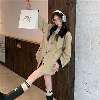 YF3841-图片色咖啡色辣妹新款牛仔衫 慵懒风显瘦POLO领长袖工装夹克上衣