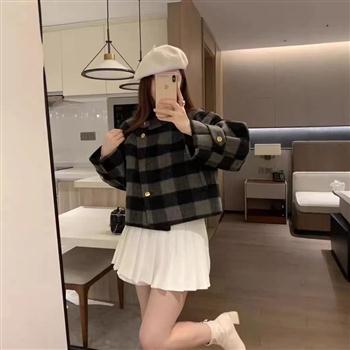 YF3819-(2色入内)秋冬撞色格子设计系扣长袖不规则裁剪加厚毛呢短款外套