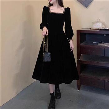 YF3793-图片色优雅时尚围边方领设计长袖套头修腰赫本风金丝绒冬季连衣裙