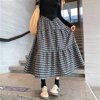 YF3798-图片色时尚松紧腰复古格子荷叶边设计A字蛋糕裙 优雅气质半身裙