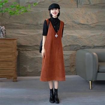 YF3799-(2色入内)高级感冬季灯芯绒背心裙 时尚V字宽松过膝显瘦连衣裙