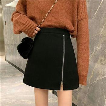 YF3795-图片色时尚别致侧拉链开叉收腹高腰A字包臀黑色毛呢半身裙