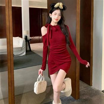 YF3796-(2色入内)欲女风镂空长袖系蝴蝶结修腰弹力包臀交叉别致连衣裙