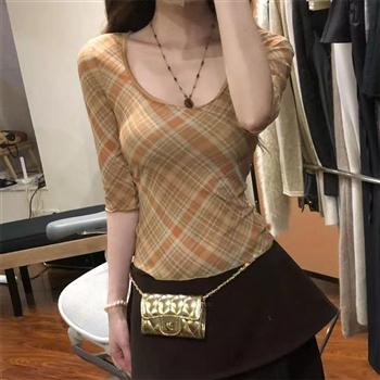 YF5915-图片色春秋蕾丝圆领长袖格子菱形印花弹力修身显瘦外穿T恤