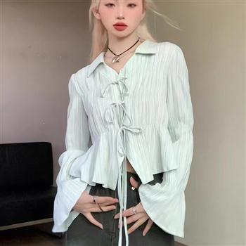 YF5917-图片色甜美微喇叭长袖翻领系蝴蝶结系扣褶折绑带小新款娃娃装上衣