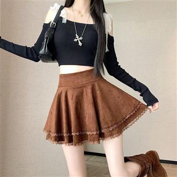YF5923-(2色入内)仿皮草仿鹿皮蕾丝包边A字二层蓬蓬设计防走光短裙