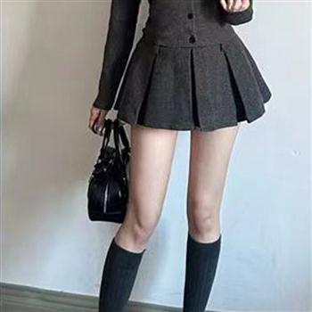YF5927-图片色韩版撞色高腰褶折收腹显瘦A字设计秋冬原宿风防走光短裙