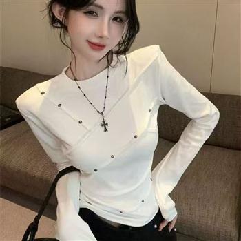 YF5929-(2色入内)韩版不规则褶折铆钉设计圆领长袖慵懒风弹力修身别致上衣