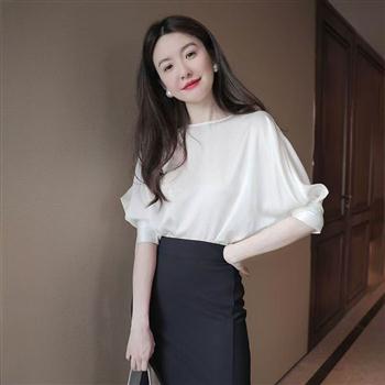 YF5931-图片色甜美时尚蝙蝠袖卷边套头宽松显瘦简约设计别致雪纺上衣
