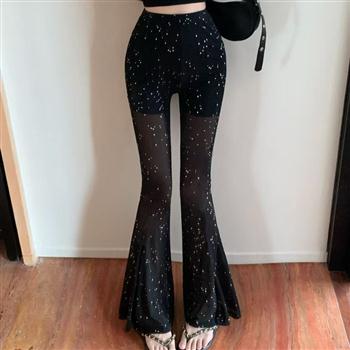 YF5892-图片色韩版高腰微喇叭亮闪闪设计弹力包臀微喇叭坠地感网纱长裤