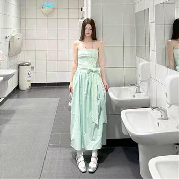YF5893-图片色一字肩抹胸弹力修腰系蝴蝶结过膝中长款拼接连衣裙