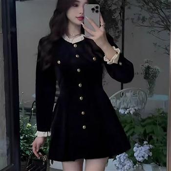YF5897-图片色名媛气质长袖花边领撞色设计排扣修腰复古气质连衣裙