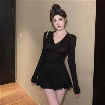 YF5898-(2色入内)性感时尚两件套秋冬长袖POLO领修身上衣十荷叶边A字短裙