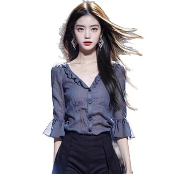 YF5901-图片色甜美口别致微喇叭荷叶边V领系扣绉折感修身显瘦上衣