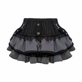 YF5902-图片色精品收腹高腰A字褶折二色拼接排扣条纹蕾丝边设计短裙